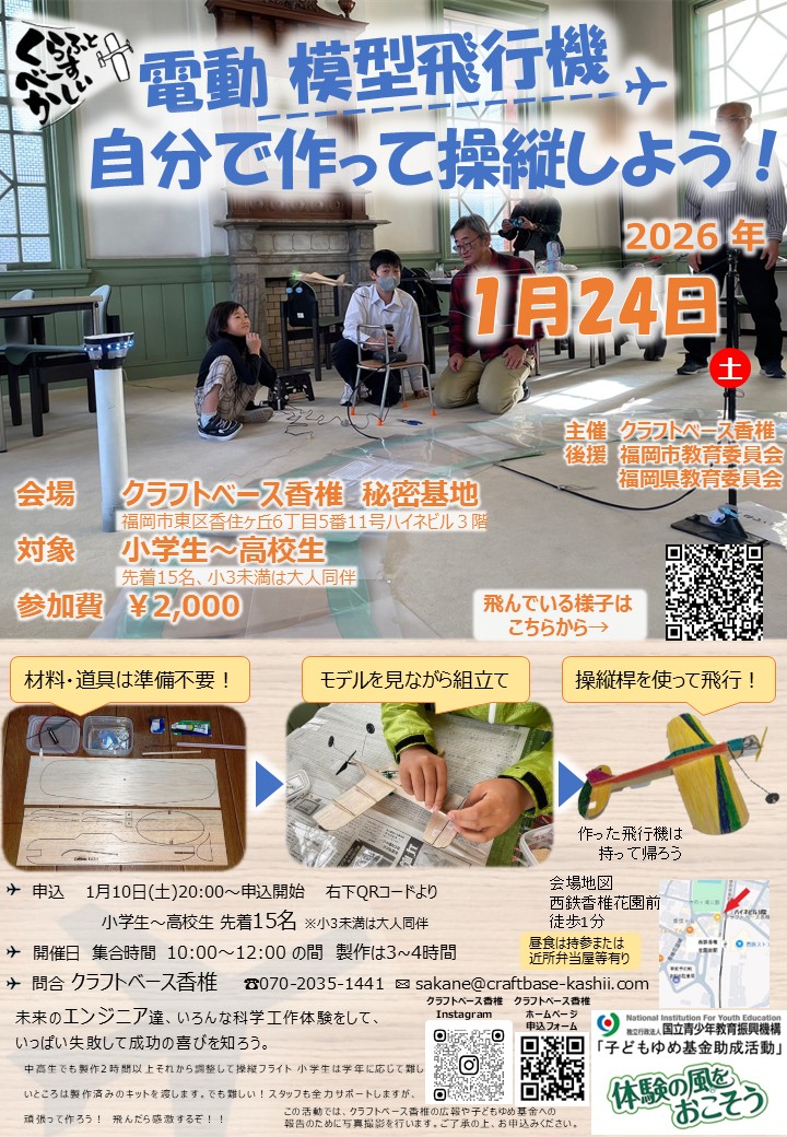 即日満席になりました 次回はR7年11月29日(土)開催です。 電動飛行機自分で作って、自分で飛ばそう! ~くるくるプレーン体験~